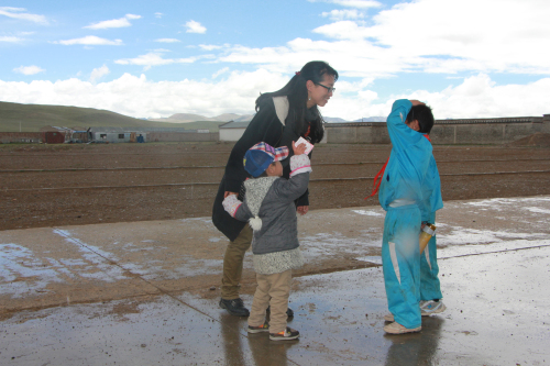 2007年8月援教期滿后,白覺措回到拉薩,在當雄縣納木湖鄉(xiāng)中心小學任教。四千八百米的納木湖鄉(xiāng)中心小學是拉薩市海拔最高的學校。每到冬天,這里都會迎來大風雪。而在大雪封山時,蔬菜是運不進來的。所以,白覺措和其他老師還要利用休息的時間帶領學生們在學校的高寒溫棚內(nèi)自己種菜,以備不時之需。白覺措淡淡得說道:“這里的夏天是很美,冬天卻讓人受不了。而且夏天并不是天天都是風和日麗,時不時還會來場冰暴。”正說話間,豆大的冰雹就下起來,“噼哩叭啦”打在窗戶上。白覺措急忙起身向外走去,因為正值午飯時間,學生們正朝食堂走向。天冷地滑,怕學生摔倒白覺措拉著自己兩歲半的兒子,站在空地上,對著遠處跑來的學生不停地喊道:“慢點,慢點,小心摔倒!……”。