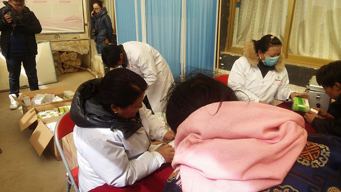 義診活動在下午三點(diǎn)半開始,前來就診咨詢的群眾絡(luò)繹不絕。醫(yī)務(wù)人員在為患病群眾把脈號診、開處方的同時,結(jié)合那曲縣羅瑪鎮(zhèn)群眾常見病、多發(fā)病及高海拔地區(qū)的氣候特點(diǎn),給當(dāng)?shù)厝罕娞岢隽巳粘I铒嬍辰ㄗh,在疾病預(yù)防、降低常見病發(fā)病率方面提供生活指南。義診期間,醫(yī)療服務(wù)小分隊醫(yī)務(wù)人員加班加點(diǎn),共為羅瑪鎮(zhèn)的400余名群眾進(jìn)行了義診檢查,發(fā)放藥品價值2萬余元,在為患病群眾解除病癥、減輕病痛的同時,切實(shí)溫暖了廣大群眾的心。