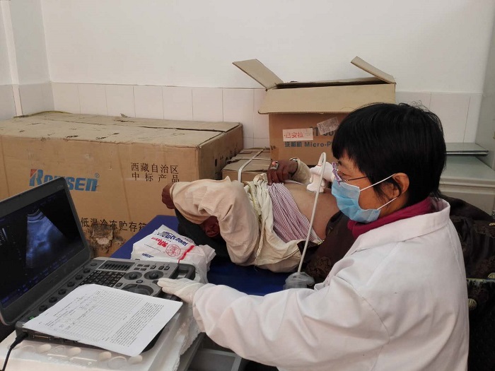 10月13日革吉縣衛(wèi)生院,鐘義華檢驗士、劉冬梅醫(yī)師與丁雪琴醫(yī)師為周邊牧民檢查。當忙碌的工作接近尾聲時,醫(yī)療組得知還有三名行動不便的老百姓不能前來檢查,即刻攜帶儀器,前往老百姓家里,為他們做包蟲病篩查。當日鐘義華組共篩查148人、1例陽性。