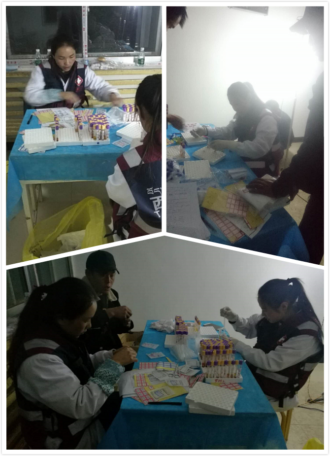 10月13日文布鄉(xiāng),衛(wèi)生院里一大早就擠滿了等待檢查的村民,格桑拉吉技師與劉亞美護士顧不上休息一直檢查到下午四點,才匆匆吃了午飯,之后又繼續(xù)檢查,當天做完最后一例檢查已接近晚上八點。由于人手不夠,劉亞美護士完成抽血后,在當?shù)匦l(wèi)生院拉瓊老師與格桑拉吉技師的協(xié)助下對采集的血液進行分離,一直工作到凌晨才結束。伴著夜色,格桑拉吉技師與劉亞美護士拖著疲憊的身體回到宿舍,來不及洗漱,倒在床上就睡著了。當日,格桑拉吉組共篩查120例,陽性4例,疑似1例。