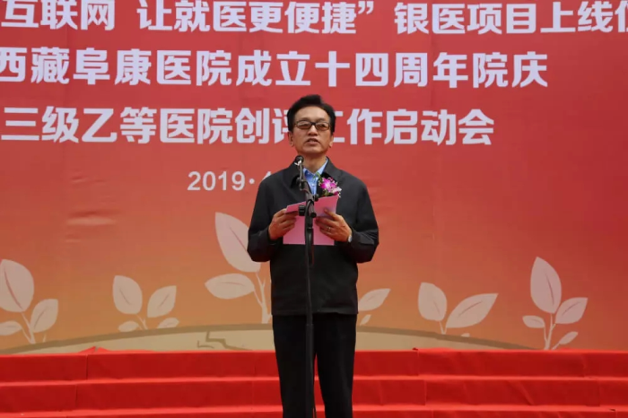 春日的圣城拉薩陽光明媚,生機(jī)盎然。2019年4月28日,注定是一個(gè)不平凡的日子!下午15時(shí),來自自治區(qū)政府部門、各大金融機(jī)構(gòu)、科技教育單位的12位嘉賓和阜康醫(yī)院的廣大醫(yī)務(wù)人員匯聚一堂,共同見證建設(shè)銀行西藏分行、西藏阜康醫(yī)院“醫(yī)療健康+互聯(lián)網(wǎng),讓就醫(yī)更健康”銀醫(yī)項(xiàng)目上線暨阜康醫(yī)院成立十四周年院慶三級(jí)乙等醫(yī)院創(chuàng)評(píng)工作正式啟動(dòng),標(biāo)志著在雪域高原上成功走過十四年光輝歷程的阜康醫(yī)院,正在一個(gè)全新的起點(diǎn)上承載著“健康西藏”的光榮使命再次揚(yáng)帆遠(yuǎn)航、整裝出發(fā)!