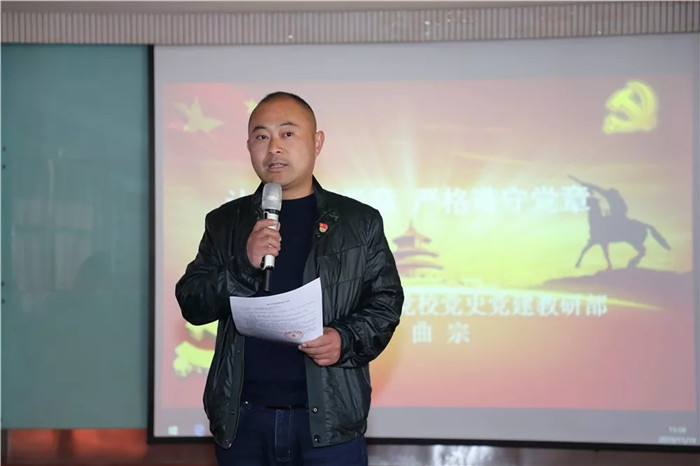 曲宗副教授首先明確了黨章 “根本大法”的地位,指出黨章是規(guī)范和指導(dǎo)黨的工作、黨內(nèi)活動(dòng)、黨的建設(shè)的根本依據(jù)。隨后曲宗副教授介紹了黨章的歷史沿革,以及十九大修改黨章的歷史意義和重要內(nèi)容,號(hào)召每一名黨員認(rèn)真學(xué)習(xí)黨章,嚴(yán)格遵守黨章,時(shí)刻與黨中央保持一致,自覺做到“兩個(gè)維護(hù)”。要求每一名黨員都把黨章作為政治思想建設(shè)方面的X光機(jī),每年對照黨章給自己“體檢”一下,紅紅臉、出出汗,牢記入黨初心、遵守黨的紀(jì)律,維護(hù)一名黨員的思想行為純潔性。