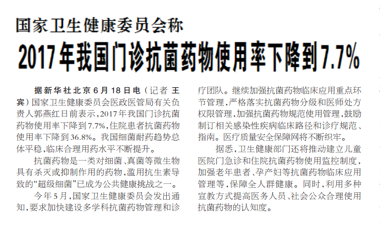 據(jù)新華社北京6月18日電 (記者 王賓) 國家衛(wèi)生健康委員會醫(yī)政醫(yī)管局有關(guān)負責人郭燕紅日前表示,2017年我國門診抗菌藥物使用率下降到7.7%,住院患者抗菌藥物使用率下降到36.8%。我國細菌耐藥趨勢總體平穩(wěn),臨床合理用藥水平不斷提升。