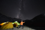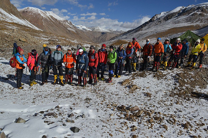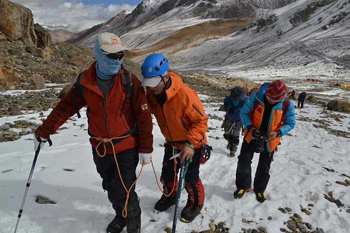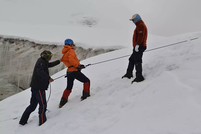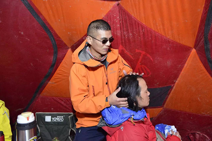 在海拔5500米處的雪線位置,教練們,選擇了一處較為平緩的雪坡,作為大本營(yíng),在這里對(duì)隊(duì)員們進(jìn)行登頂前的指導(dǎo)訓(xùn)練。指導(dǎo)隊(duì)員們使用上升器與下降器,體驗(yàn)穿著高山靴帶著冰爪走路的感覺,教練們?cè)谶@里認(rèn)真介紹技術(shù)要領(lǐng),并耐心解答隊(duì)員們提出的各種問(wèn)題。休息之余大家都躲在帳篷里,有說(shuō)有笑,完全消除了屋外雪山的寒冷。有從內(nèi)地來(lái)的隊(duì)友,因高原反應(yīng),頭疼難忍,張洪就幫他們一一按摩推拿,緩解疼痛,大家就像一家人,其樂(lè)融融。